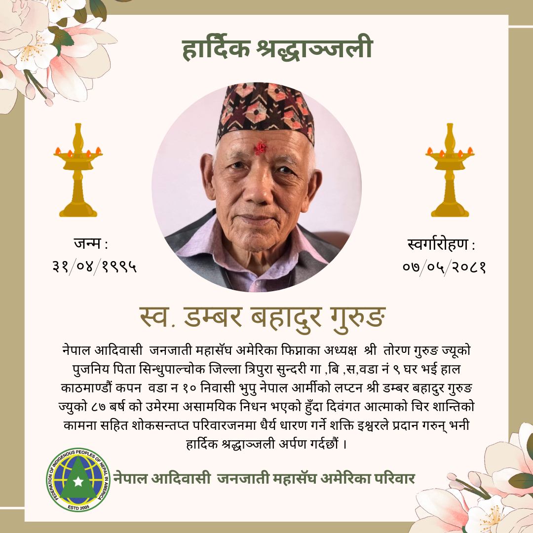 नेपाल आदिवासी जनजाती महासॅघ अमेरिका फिप्नाका अध्यक्ष श्री तोरण गुरुङ ज्यूको पुजनिय पिता सिन्धुपाल्चोक जिल्ला त्रिपुरा सुन्दरी गा ,बि ,स,वडा नं ९ घर भई हाल काठमाण्डौं कपन वडा न १० निवासी भुपु नेपाल आर्मीको लप्टन श्री डम्बर बहादुर गुरुङ ज्युको ८७ बर्ष को उमेरमा असामयिक निधन भएको हुँदा दिवंगत आत्माको चिर शान्तिको कामना सहित शोकसन्तप्त परिवारजनमा धैर्य धारण गर्ने शक्ति इश्वरले प्रदान गरुन् भनी हार्दिक श्रद्धाञ्जली अर्पण गर्दछौं ।