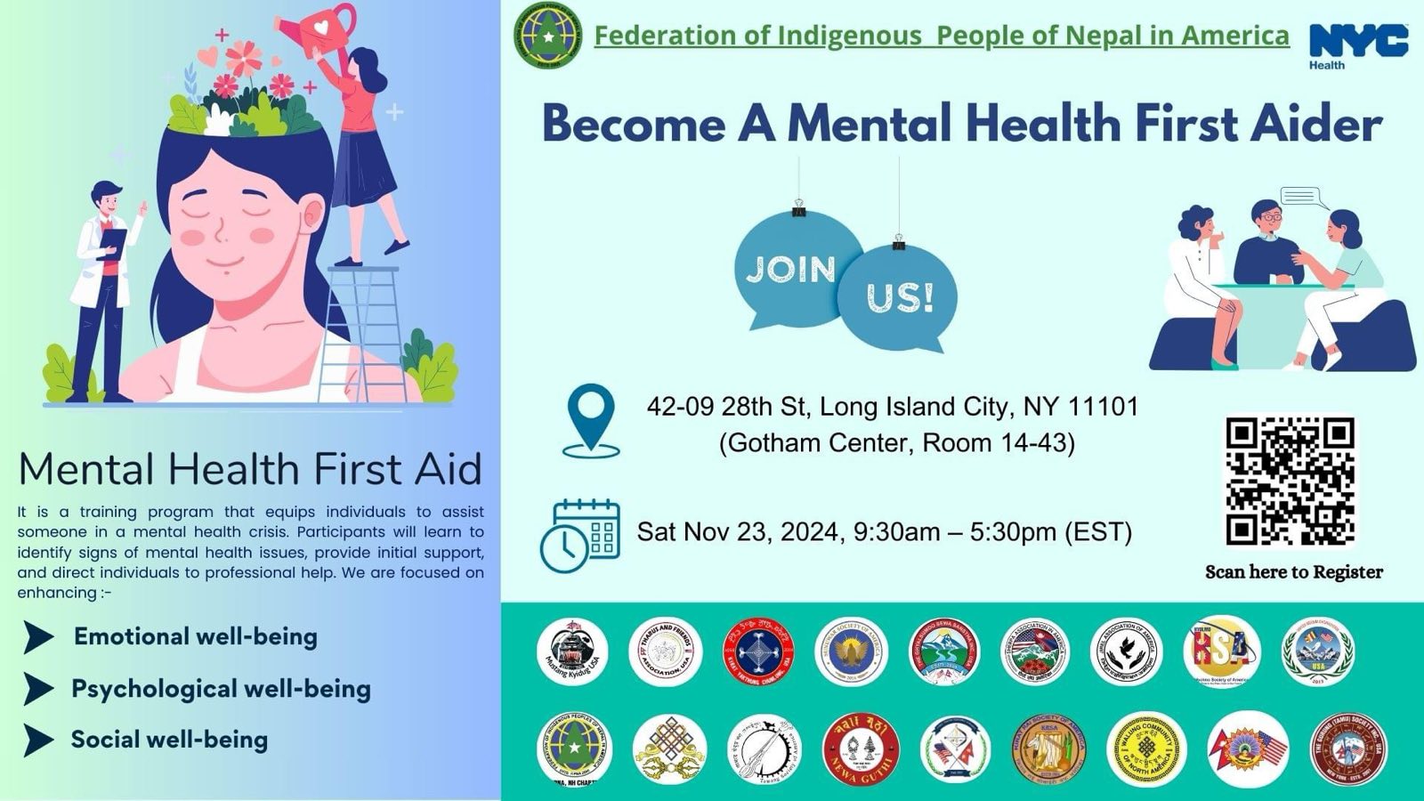 FIPNA is proud to partner with NYC Health to offer Mental Health First Aid Training on Saturday, November 23, 2024. 🧠💙